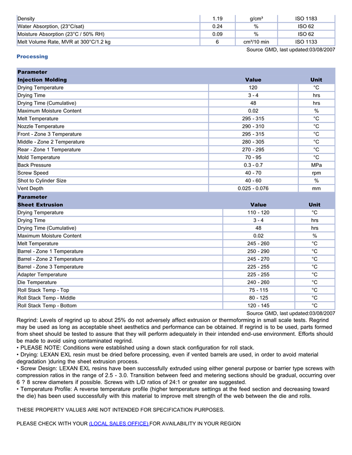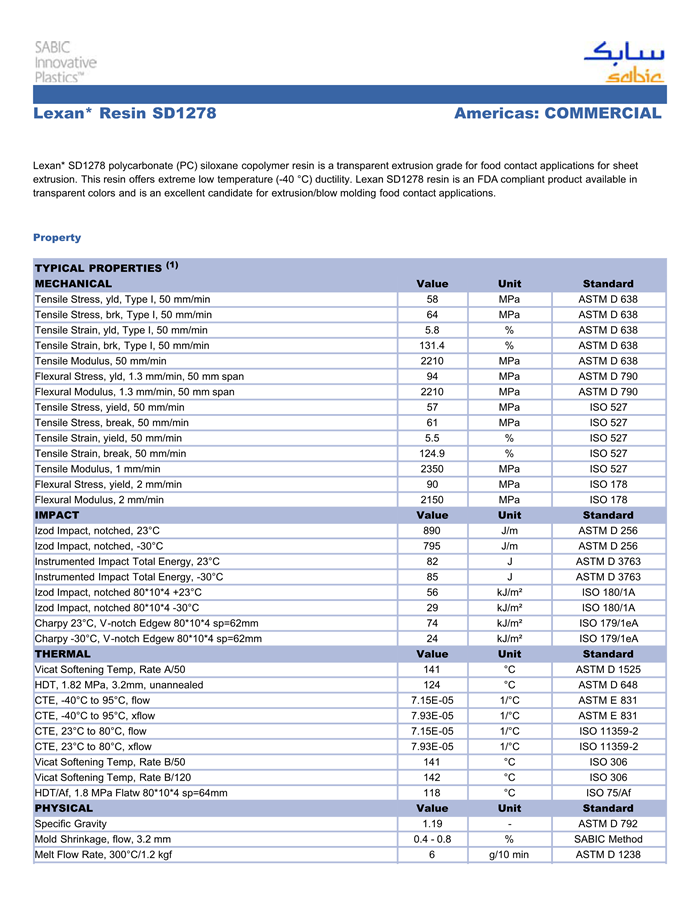 应用范围:产品描述LEXAN PC SD1278物性表Lexan SD1278 resin是一种聚碳酸酯(PC)产品,可以通过片材挤出成型或注射成型进行加工, 典型应用领域为:食品接触应用。特性包括:共聚物可接触食品柔软