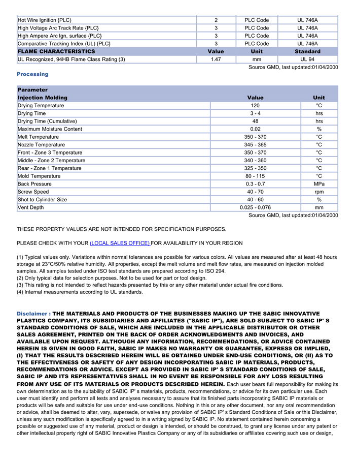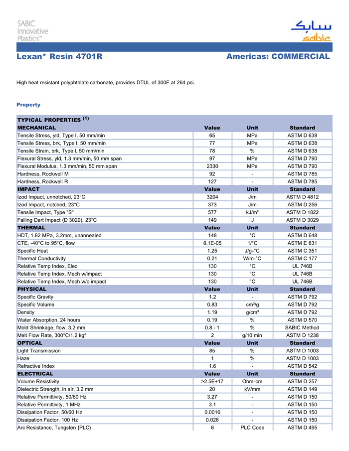 应用范围:产品描述Lexan PC 4701R物性表Lexan 4701R resin是一种聚酯碳酸酯 (PPC)产品,。 它可以通过注射成型进行加工,在北美洲有供货。 典型应用领域为:汽车行业。 主要特性为:耐热。相关颜色色号:4701R-700001、4701R-GN8B062T、4701R-110001High heat resistant polyphthlate carbonate, provid