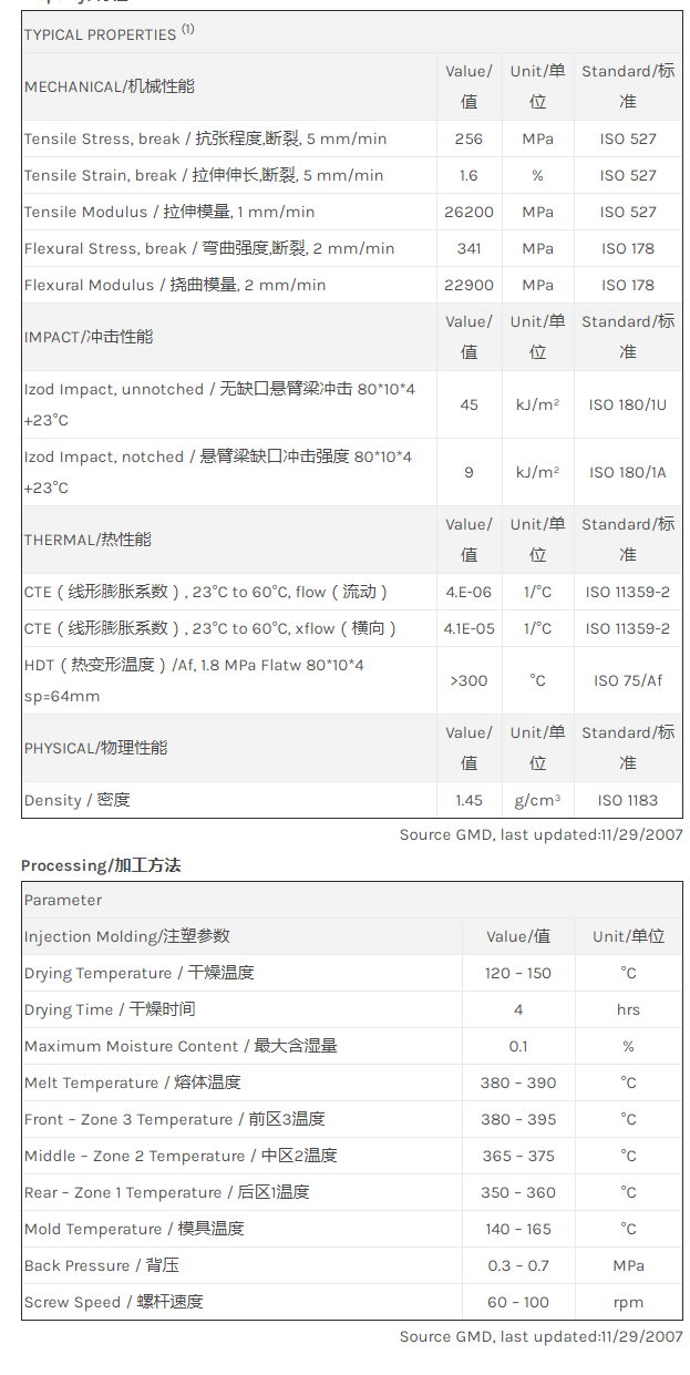 应用范围: 产品描述 LNP Thermocomp LC008EXP物性表 “LNP THERMOCOMP LC008EXP是一种聚醚醚酮(PEEK)材料,含有的填充物为碳纤维增强材料,加工方式为:注射成型。 LNP THERMOCOMP LC008EXP的主要特性有: 通过ROHS认证 传导性” LNP* THERMOCOMP* LC008EXP is a compound based on