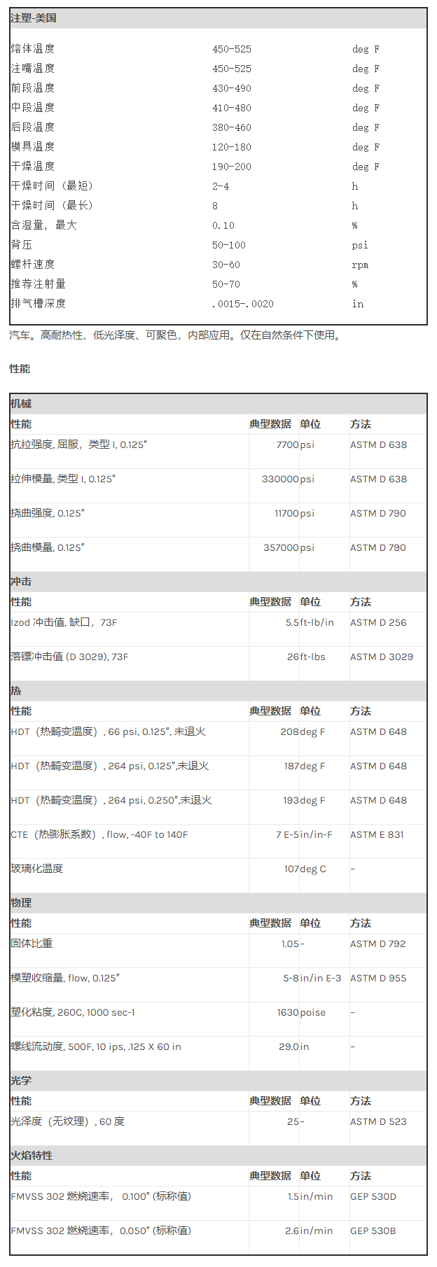 应用范围:产品描述CYCOLAC ABS BDT5510物性表汽车。高耐热性、低光泽度、可聚色,内部应用。仅在自然条件下使用。加工