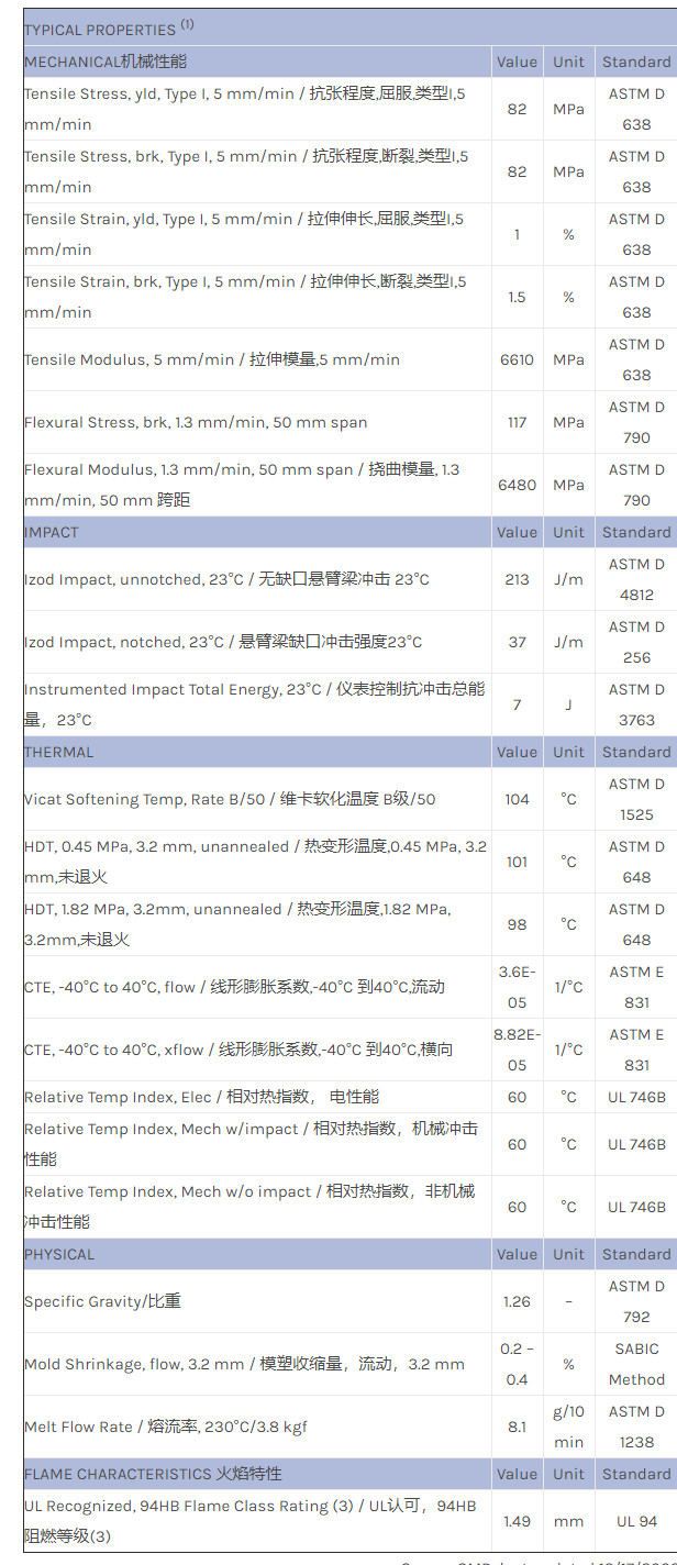应用范围:产品描述CYCOLAC ABS GF20物性表High flow, 20% glass filled ABS.
