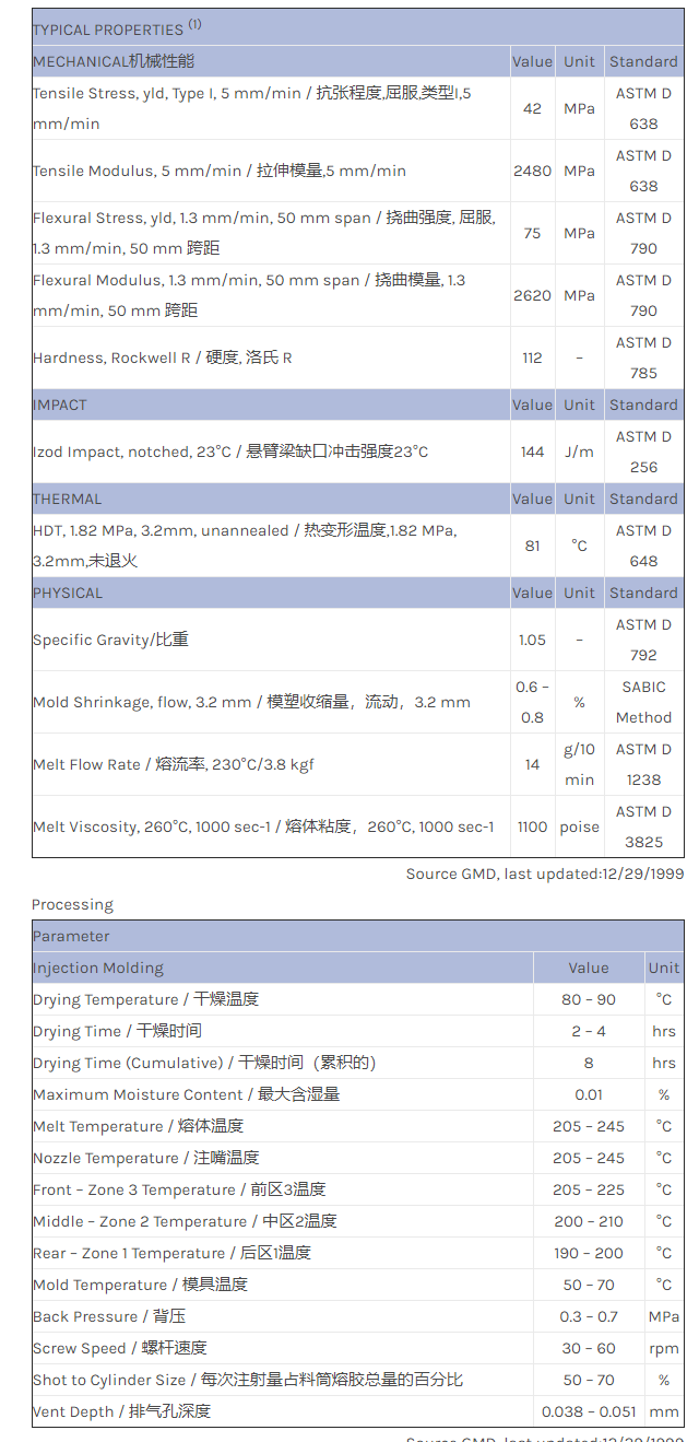 应用范围:产品描述CYCOLAC ABS GPM550M物性表GPM550M的用途:适用于磁盘制作的高流动性/最高模量材料。