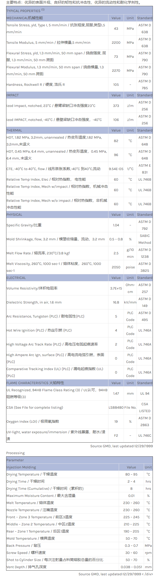 主要特点:优异的表面外观、良好的韧性和抗冲击性、优异的流动性和耐化学剂性。