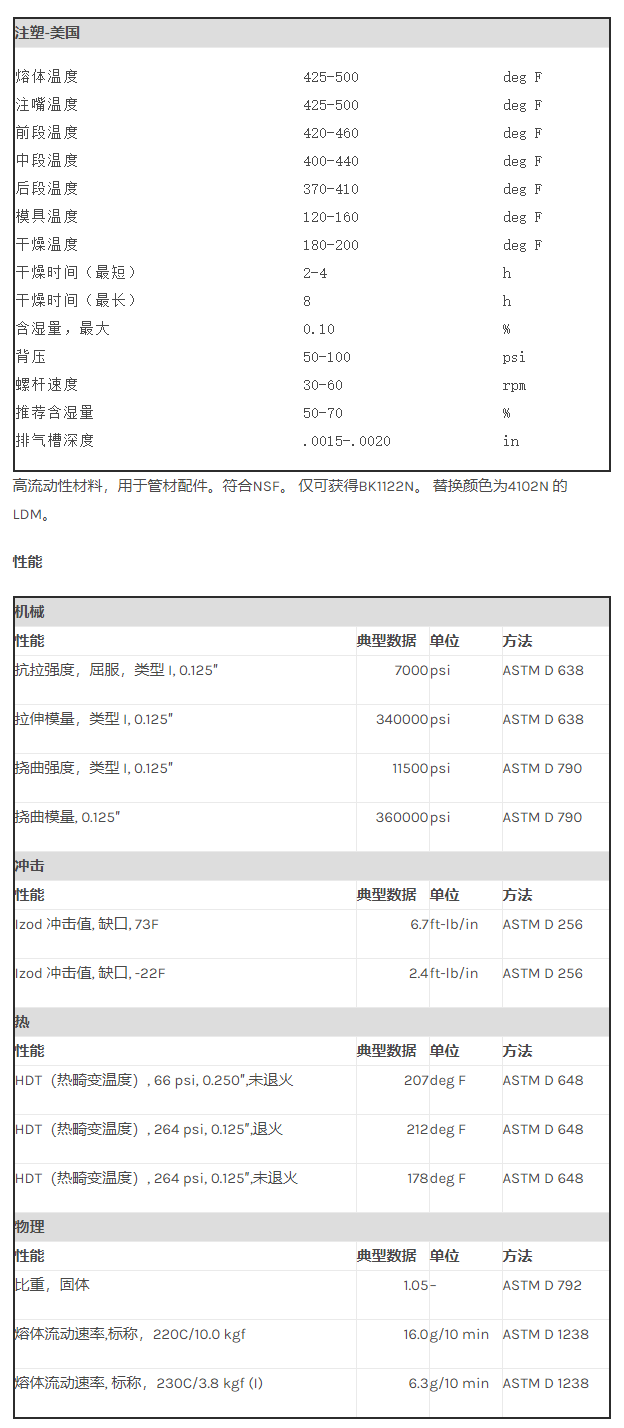 应用范围:产品描述CYCOLAC ABS LDM物性表高流动性材料,用于管材配件。符合NSF。 仅可获得BK1122N。 替换颜色为4102N 的LDM。加工