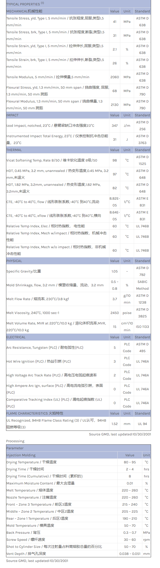 应用范围:产品描述CYCOLAC ABS MGABS01物性表Cycolac MGABS01 是一种丙烯腈丁二烯苯乙烯(ABS)产品,可以通过注射成型进行加工。特性包括:阻燃/额定火焰高光泽度耐冲击