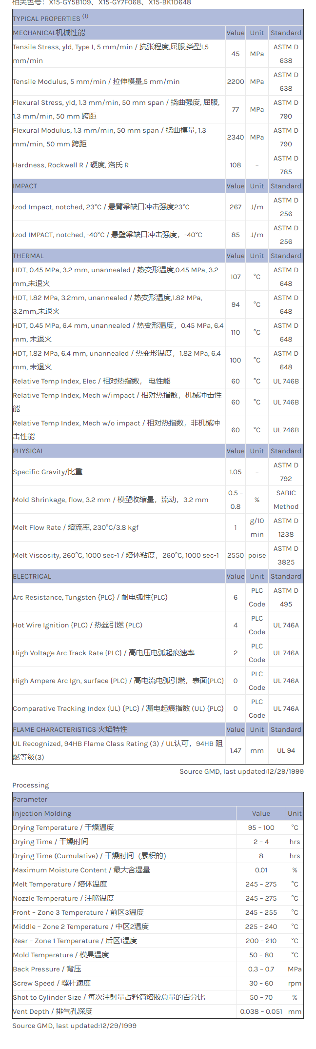 应用范围:产品描述CYCOLAC ABS X15物性表X15的主要用途:汽车特点:甚高耐热性,高抗冲击性,额定UL94 HB 值,高光泽度。相关色号:X15-GY5B109、X15-GY7F068、X15-BK1D648