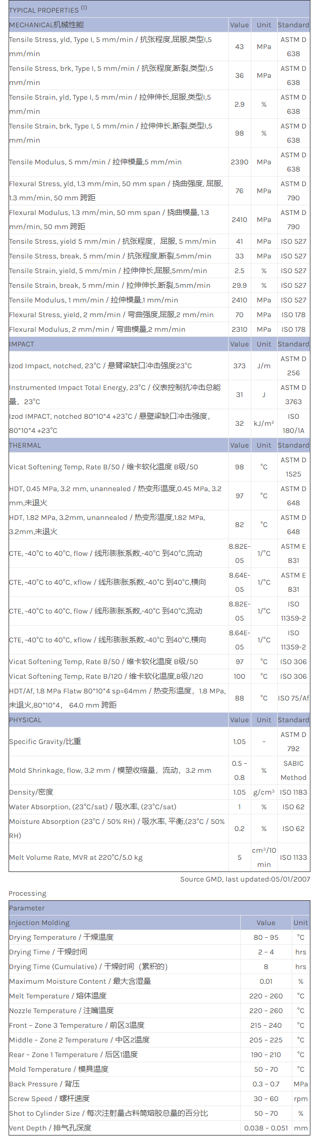 应用范围:产品描述CYCOLAC ABS MG38U物性表Cycolac MG38U 是一种丙烯腈丁二烯苯乙烯(ABS)产品,可以通过注射成型进行加工。特性包括:阻燃/额定火焰坚硬良好的韧性耐冲击耐疲劳相关色号:MG38U-WH8G001、MG38U-700578、MG38U-OR6G030、MG38U-WH8G660、MG38U-GY7G208、MG38U-BK1G268