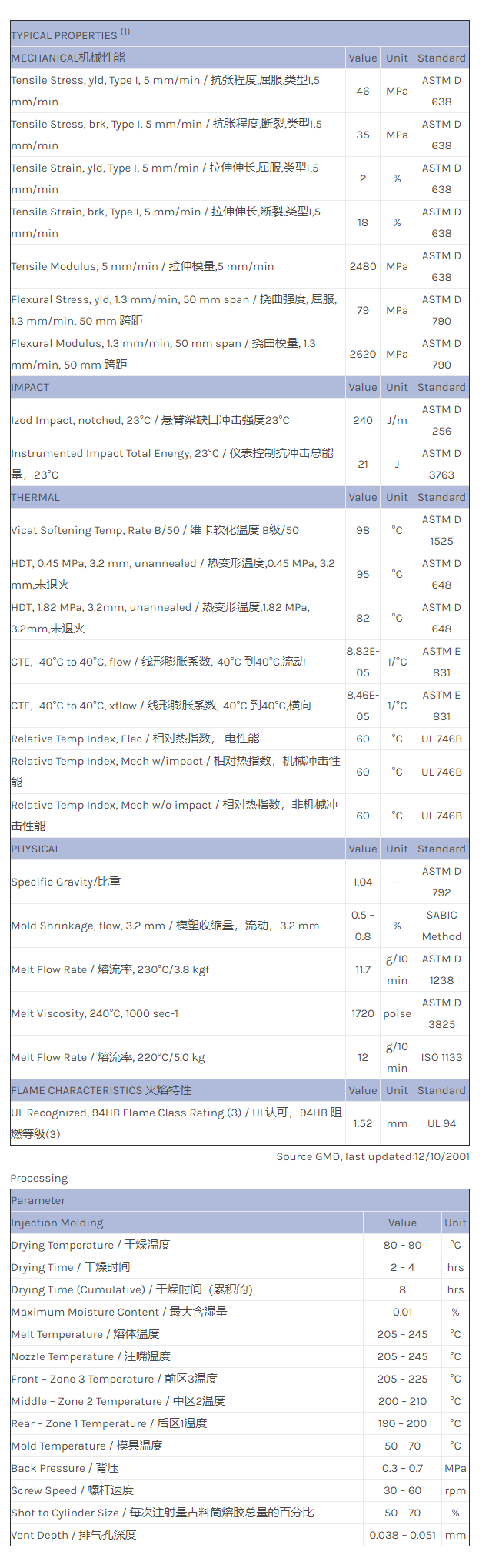 应用范围:产品描述CYCOLAC ABS MG94MD物性表Superior flow, injection molding ABS for medical applications. Good IMPACT. For thin-wall applications. Biocompatible (ISO10993). FDA compliant. Gamma & EtO sterilizable.相关色号: