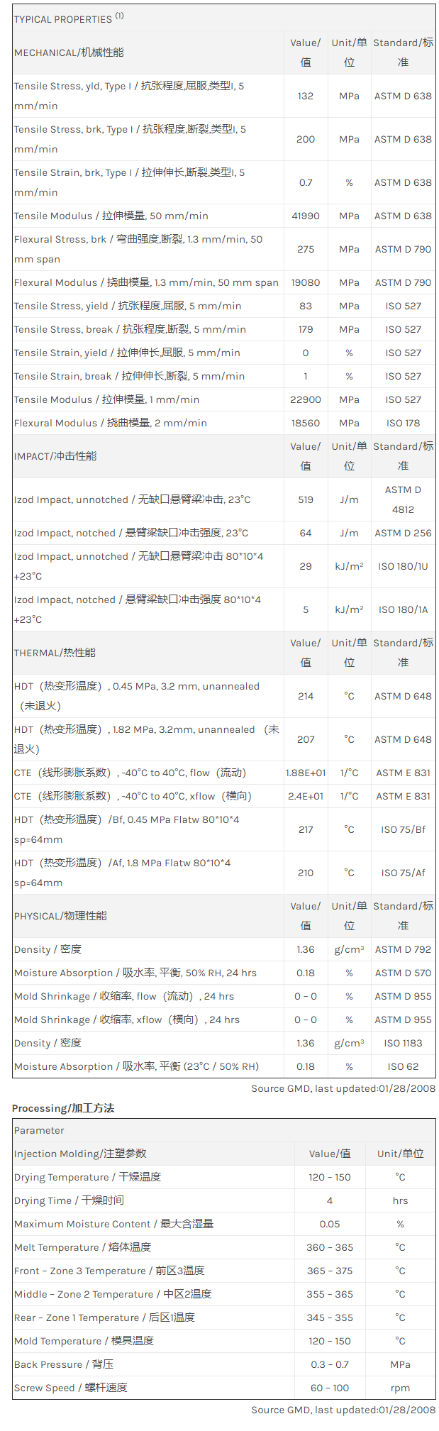 应用范围: 产品描述 LNP Thermocomp EC005R物性表 “LNP THERMOCOMP EC005R是一种聚醚酰亚胺(PEI)产品,含有的填充物为25%碳纤维增强材料,可以通过注射成型进行加工。 特性包括: 传导性 脱模剂” PEI, Carbon Fiber, Mold Release, Property/特性