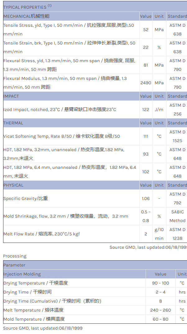 应用范围:产品描述CYCOLAC ABS GHT3512物性表High heat grade of ABS used for interior automotive components.