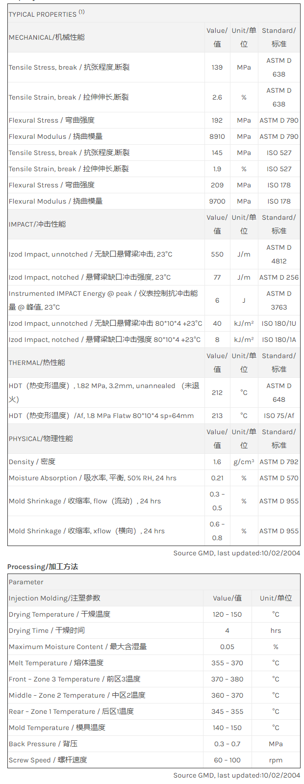应用范围: 产品描述 LNP Thermocomp JF006EXZ物性表 “LNP THERMOCOMP JF006EXZ是一种聚醚砜(PES)产品,含有的填充物为30%玻璃纤维增强材料,可以通过注射成型进行加工。 主要特性为:加工性能良好。” LNP* Thermocomp* JF006EXZ is a compound based on Polyethersulfone resin cont
