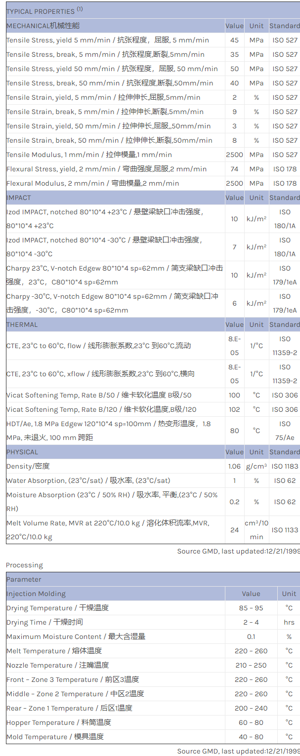 应用范围:产品描述CYCOLAC ABS MGX610SP物性表CYCOLAC MGX610SP is Obsolete; A multi purpose ABS injection moulding grade, providing a favourable balance of engineering properties. CYCOLAC MGX610SP is suitable for those