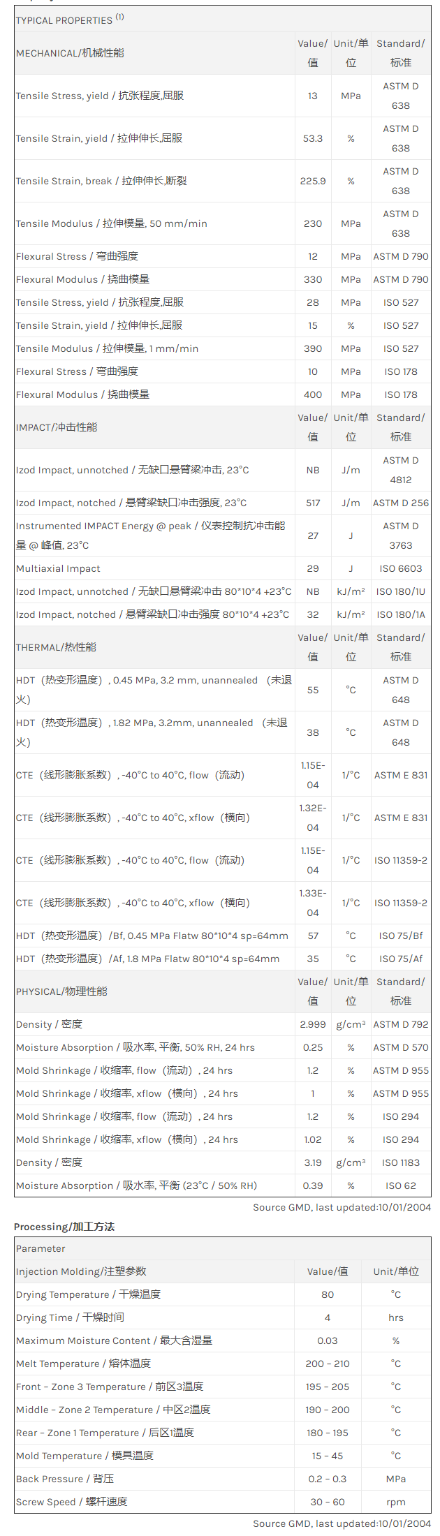 应用范围: 产品描述 LNP Thermocomp TH0300A物性表 LNP THERMOCOMP TH0300A是一种聚氨酯材料,加工方式为:注射成型。 LNP THERMOCOMP* TH0300A is a compound based on Polyurethane resin. Added features of this material include: High Specific