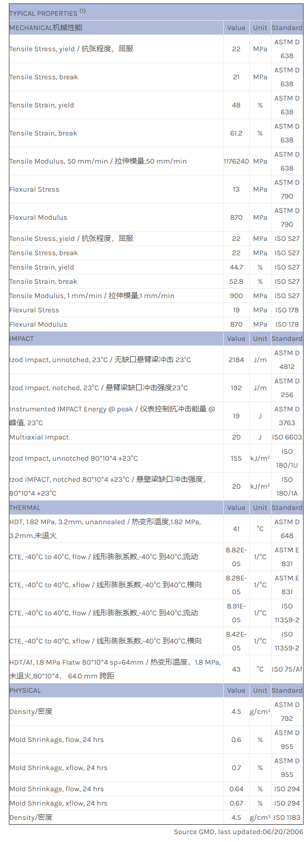 应用范围: 产品描述 LNP THERMOCOMP TH0450D物性表 LNP* Thermocomp* TH0450D is a compound based on Polyurethane resin containing High Specific Gravity/比重 Filler. Added features of this material include: High Specific