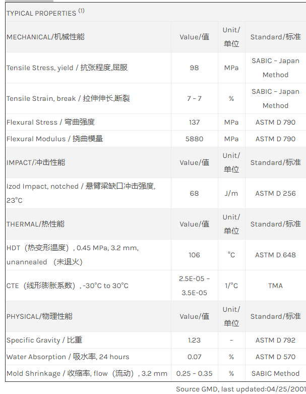 应用范围:产品描述Noryl PPO CN1134物性表“NORYL CN1134 resin是一种聚苯醚+PS(PPE+PS)材料,含有的填充物为20%未指定填料\增强材料。主要特性为:Flame Retardant。”相关颜色色号:CN1134-BK1066Property/特性