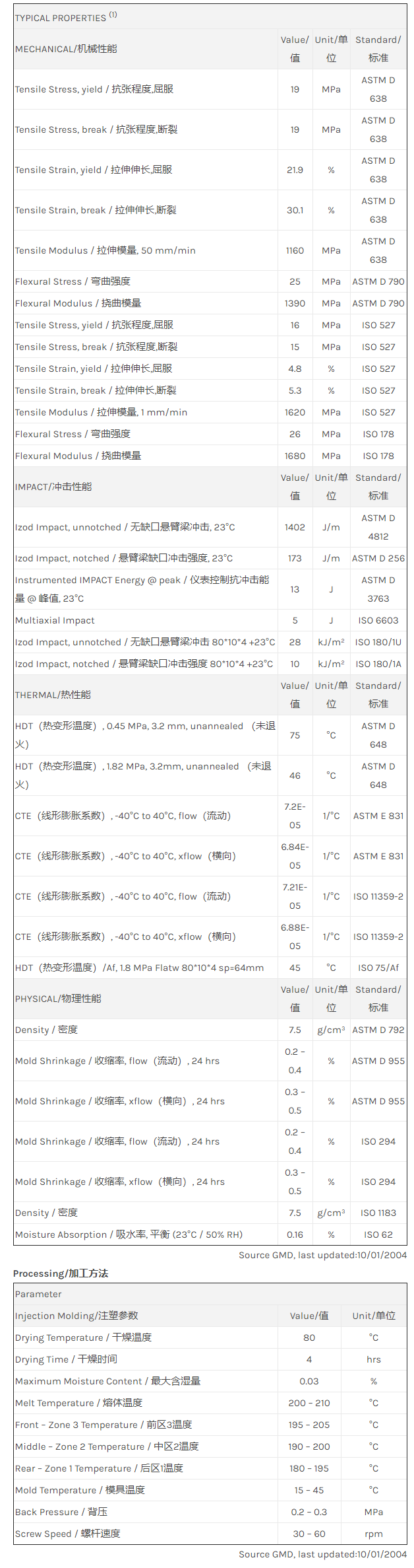 应用范围: 产品描述 LNP Thermocomp TH0750A物性表 LNP THERMOCOMP TH0750A是一种聚氨酯材料,加工方式为:注射成型。 LNP THERMOCOMP* TH0750A is a compound based on Polyurethane resin. Added features of this material include: High Specific