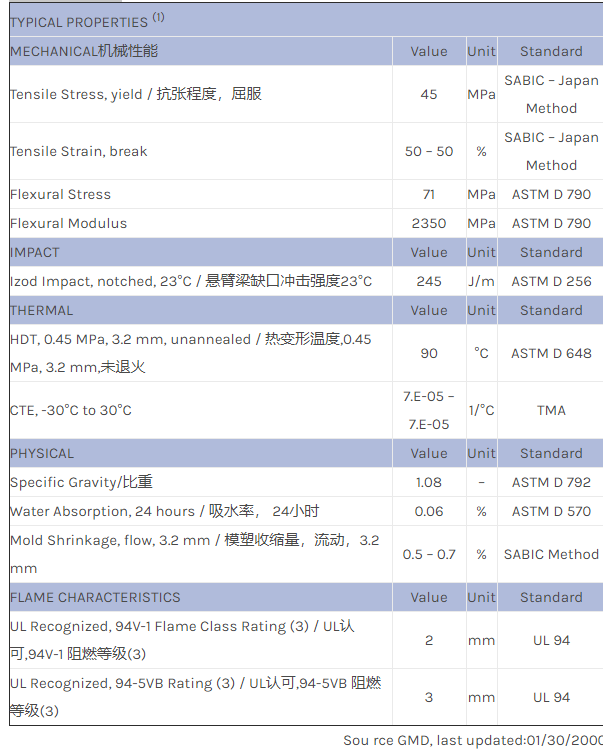 应用范围:产品描述NORYL PPO EBN90物性表NORYL EBN90 resin是一种聚苯醚+PS(PPE+PS)材料,该产品在亚太地区有供货。主要特性有:阻燃/额定火焰Flame Retardant