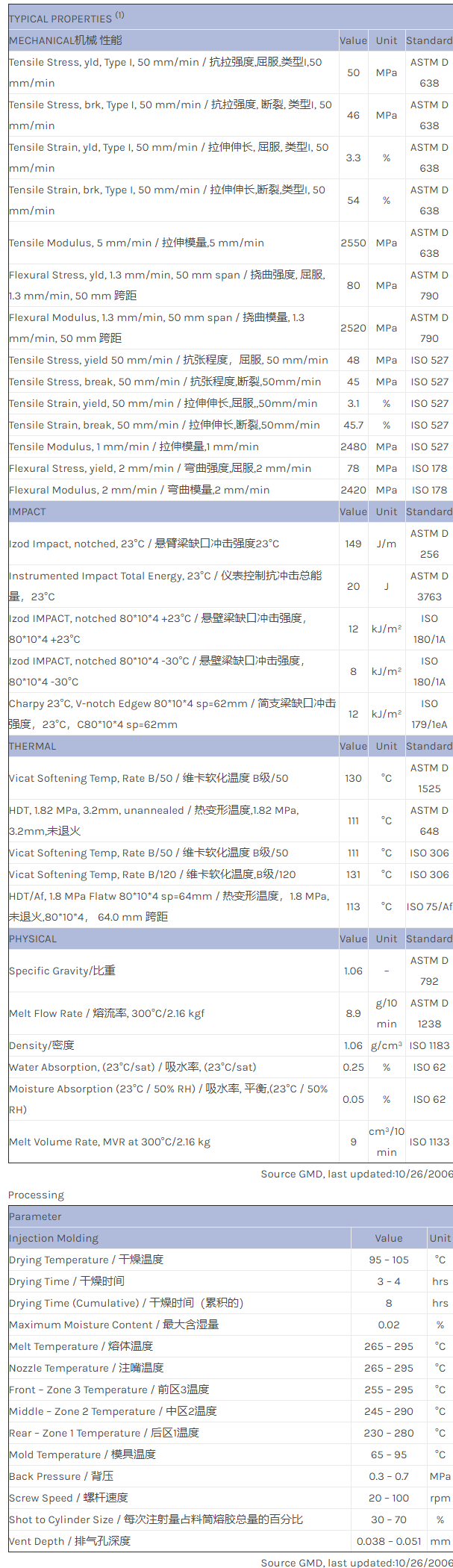 应用范围:产品描述NORYL PPO EXNL0204物性表PPE+PS blend. Unfilled. Chemical resistance. Lower Creep performance compared to PX5511. Low water absorption. Hydrolytic stability. Dimensional stability. Colors need PM Appr