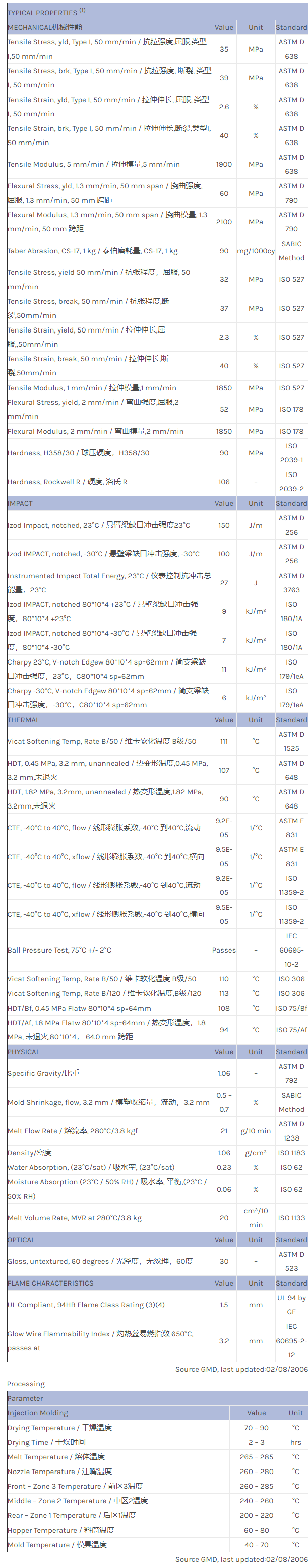 应用范围:产品描述NORYL PPO FXN099LG物性表Noryl* FXN099LG is an unfilled, modified polyphenylene ether resin designed for injection molding. This resin combines many of the inherent properties of Noryl resins with a u