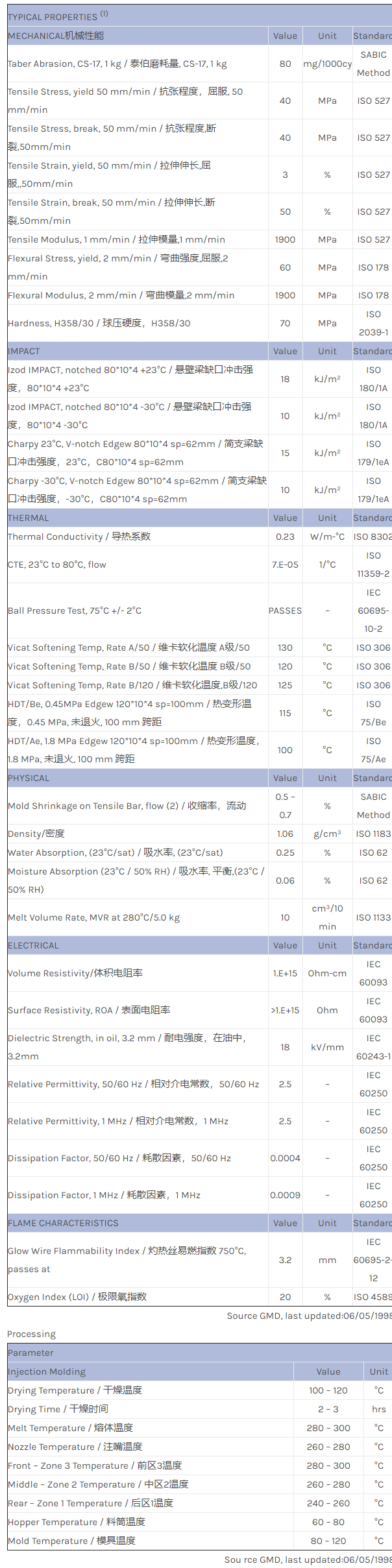 应用范围:产品描述NORYL PPO IN120物性表NORYL IN120 is an unfilled material with a Vicat B/120 of 125 ºC according ISO 306. NORYL IN120 has been developed for the interior automotive