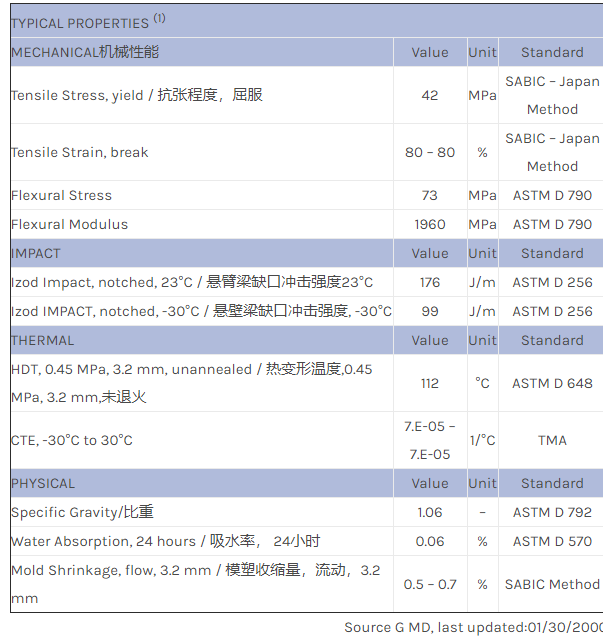 应用范围:产品描述NORYL PPO INT1000物性表