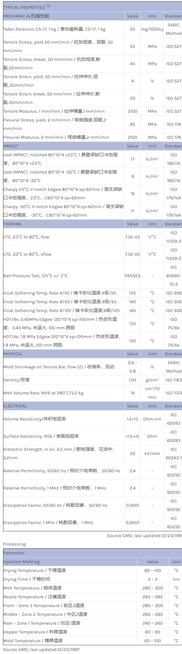 应用范围:产品描述NORYL PPO PO2319A物性表Noryl PO2319A is an unfilled, medium heat material with improved heat ageing performance.