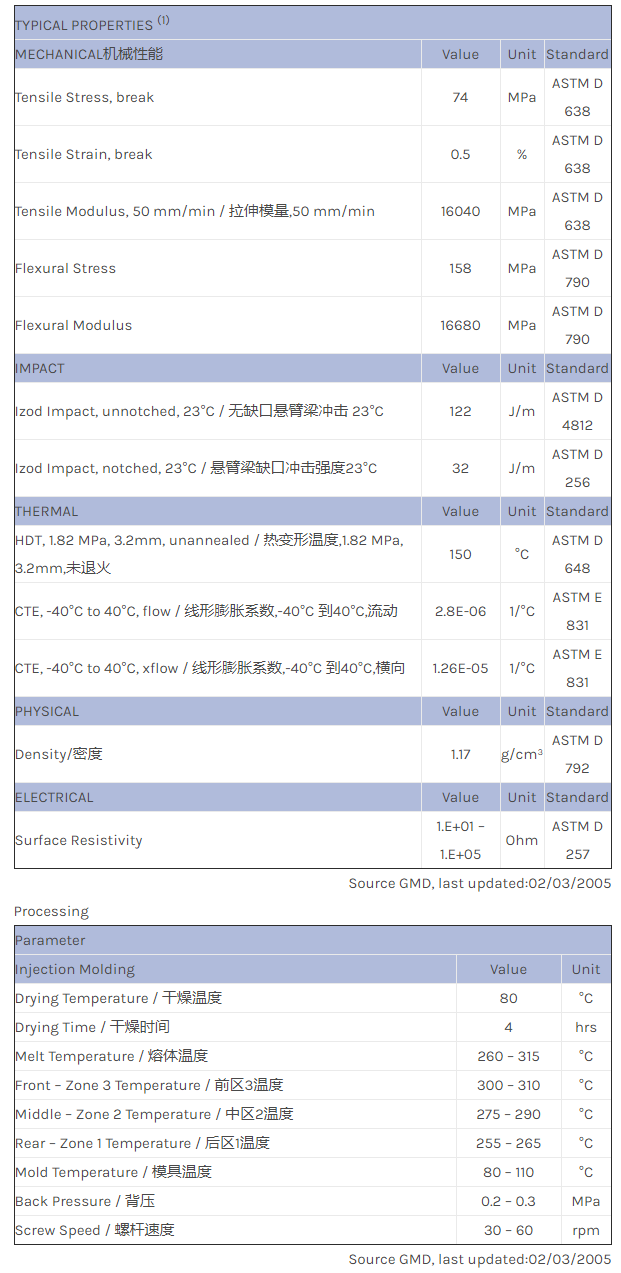 应用范围: 产品描述 LNP STATKON 9X06519物性表 LNP STAT-KON 9X06519是一种环烯烃共聚物 (COC)产品,含有的填充物为30%碳纤维增强材料,可以通过注射成型进行加工。 主要特性为:传导性。