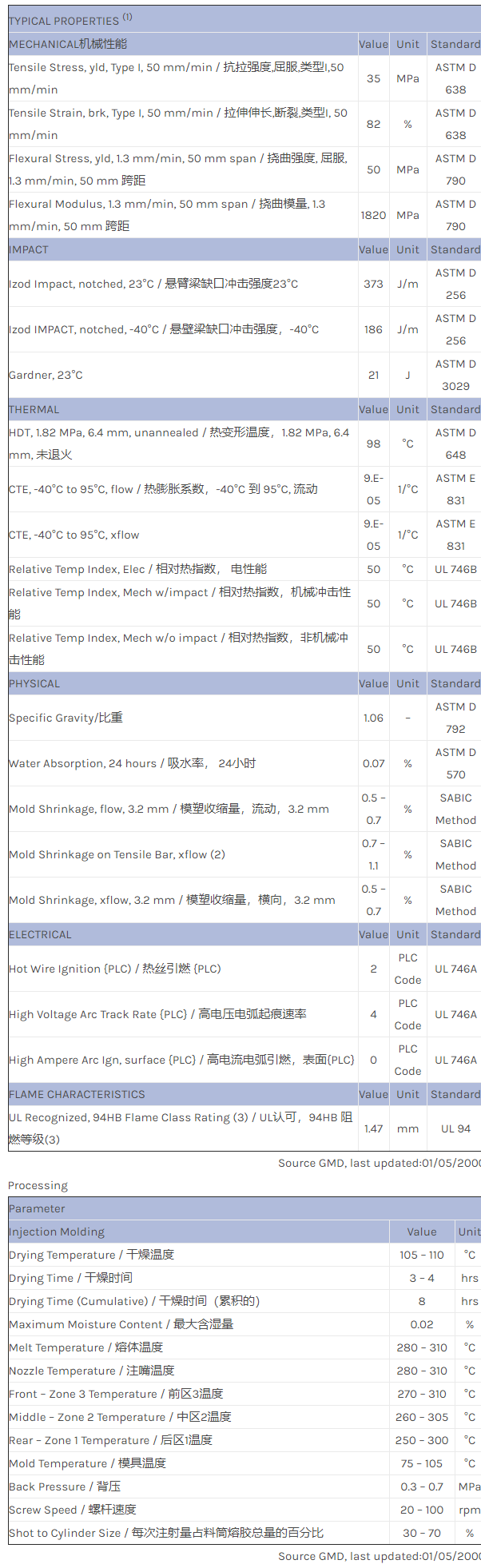 应用范围:产品描述NORYL PPO SPN410H物性表改良的生产率,高光泽。DTUL(载荷下挠曲温度):210F (99C)。UL94 额定HB值。