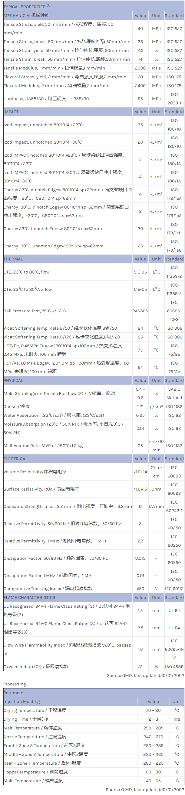 应用范围:产品描述NORYL PPO V081S物性表NORYL V081S is a high flow, UV stabilized PPO/PS blend for TV backplate applications.