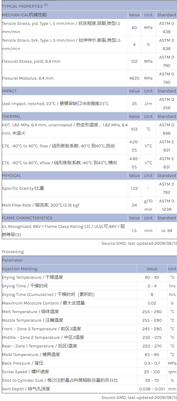 NORYL ZM3640 resin是一种聚苯醚+PS(PPE+PS)材料,含有的填充物为矿物填料,加工方式为:注射成型。