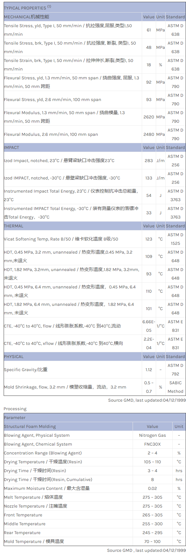 应用范围:产品描述NORYL PPO MH230物性表PPE+PS developed for the pallet program. Can be UL2335 classified and/or FM approved. Injection moldable in solid or foamed stated.