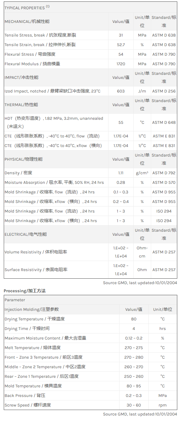 应用范围: 产品描述 LNP Statkon QD000I物性表 “LNP STAT-KON QD000I是一种聚酰胺610(尼龙6/10)材料,含有的填充物为炭粉,加工方式为:注射成型。 LNP STAT-KON QD000I的主要特性为:传导性。” LNP* Stat-kon* QD000I is a compound based on Nylon 6/10 resin containing