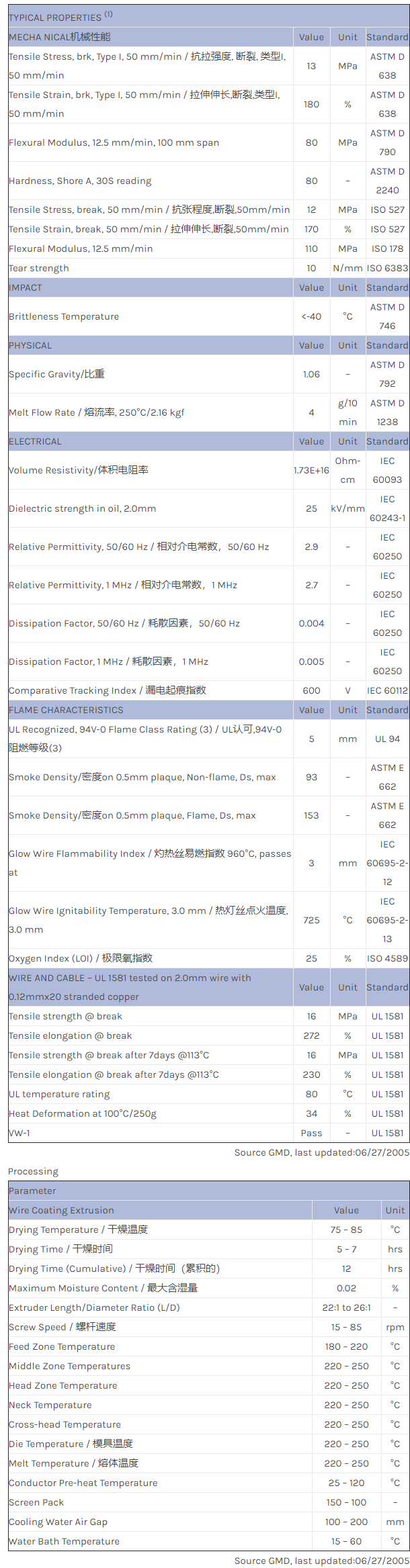 应用范围:产品描述NORYL PPO WCD801物性表Flexible, halogen free PPE-TPE extrusion grade, excellent material for applications such as wire insulation and jacket. Flame retardant performance capable of meeting UL VW1 req