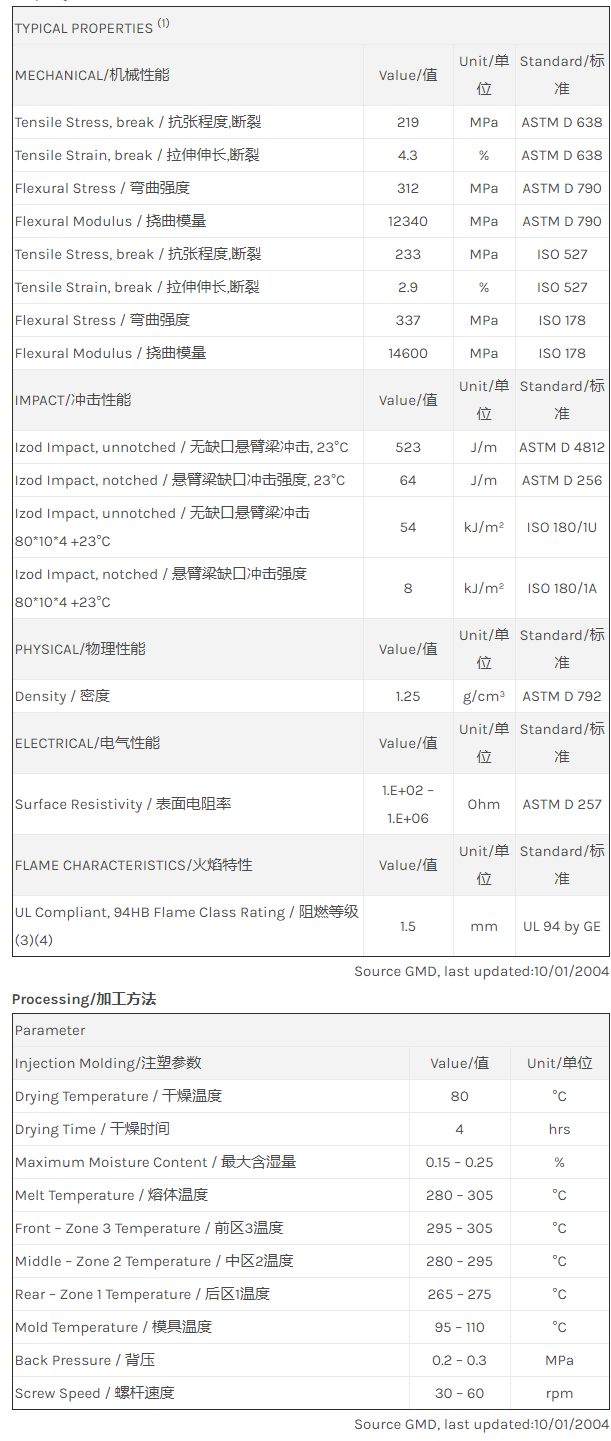 应用范围: 产品描述 LNP Statkon RE004物性表 “LNP STAT-KON RE004是一种聚酰胺66(尼龙66)产品,含有的填充物为20%碳纤维增强材料,可以通过注射成型进行加工。 特性包括: 阻燃/额定火焰 传导性” 相关颜色色号:RE004-NC LNP* Stat-kon* RE004 is a compound based on Nylon 66 resin con