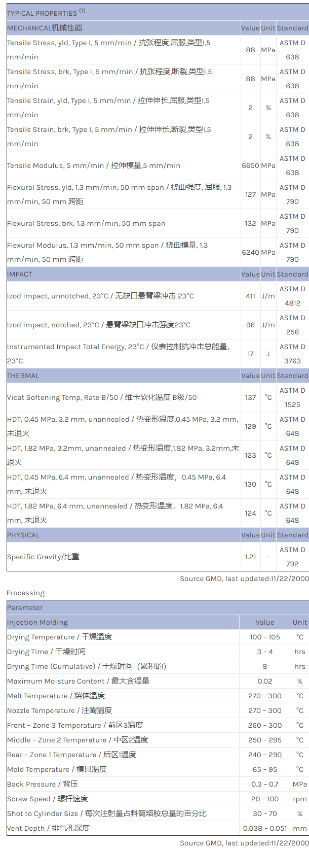 应用范围:产品描述NORYL PPO EM7422物性表PRELIMINARY DATA. 22% glass reinforced, high flow PPO.