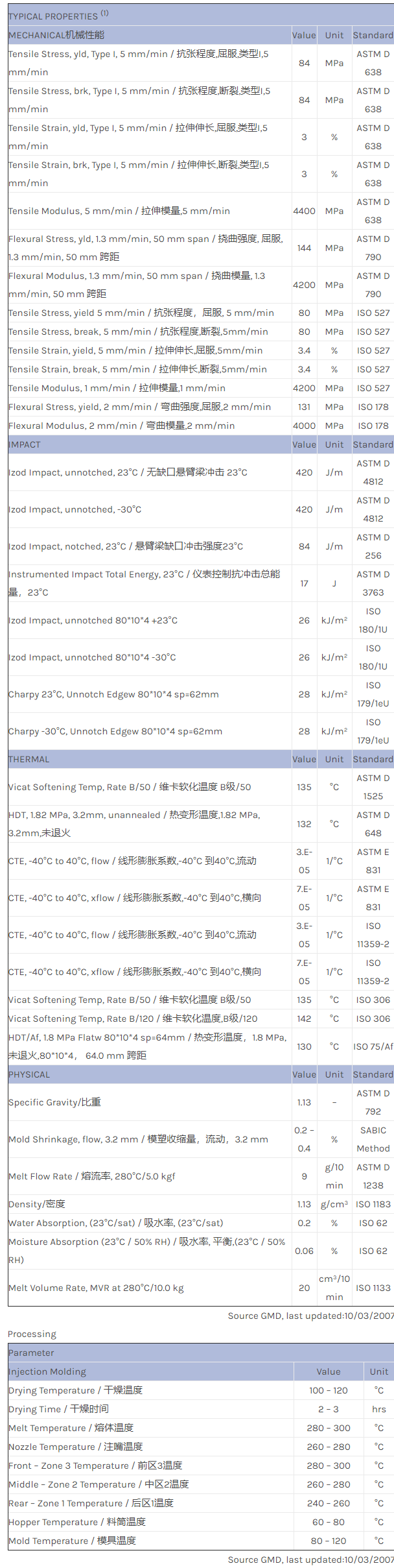 应用范围:产品描述NORYL PPO GFN1410V物性表Noryl* GFN1410V resin is a blend of polyphenylene ether (PPE) and polystyrene (PS) resin that contains 10 % glass reinforcement. The resin is suitable for injection molding. N