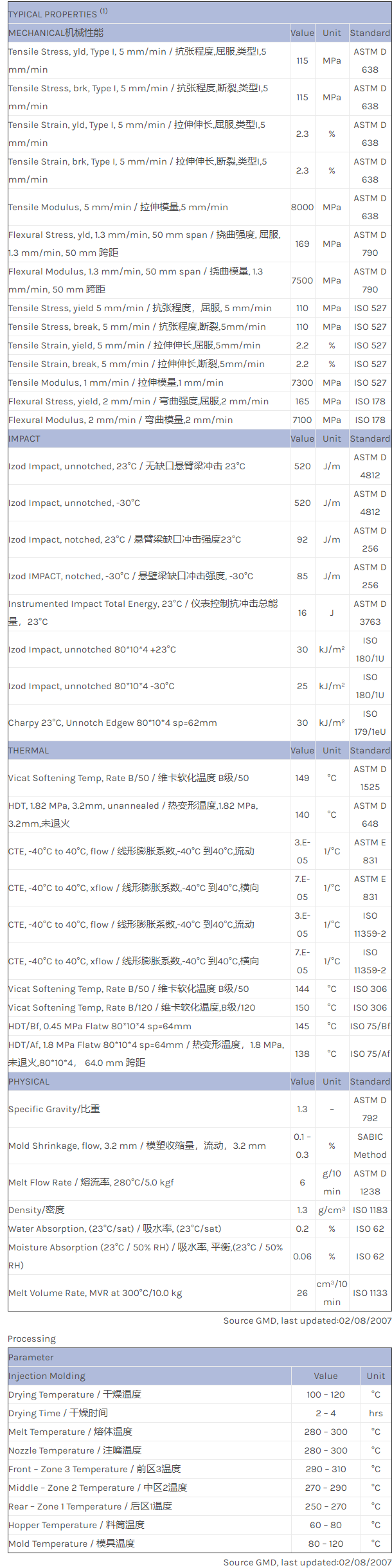 应用范围:产品描述NORYL PPO GFN1430V物性表Noryl* GFN1430V PolyPhenylene Oxide (PPO*) + Polystyrene (PS) resin is a 30 % Glass Reinforced, injection moldable grade with improved hydrolytic stability. This grade has bee