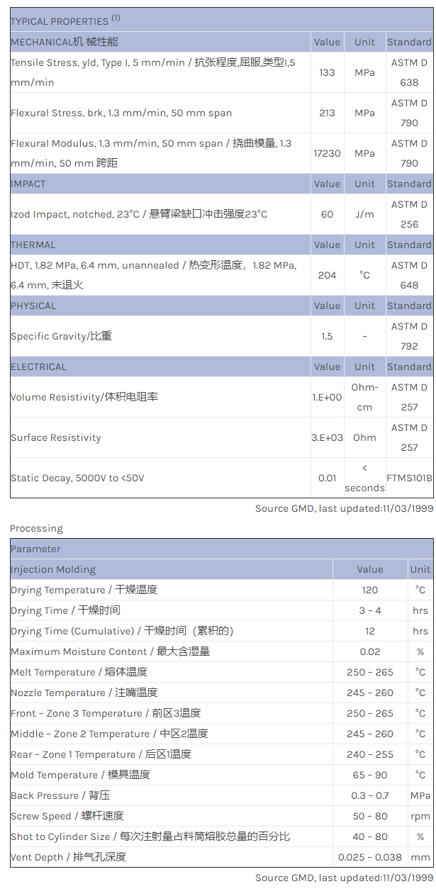 应用范围:产品描述LNP STATKON Valox_SMV5847物性表SINGLE LOT DATA. 30% CFR PBT+PET. ESD APPLICATIONS. High flow, good chemical resistance. Flame retardant additives. VC3000.