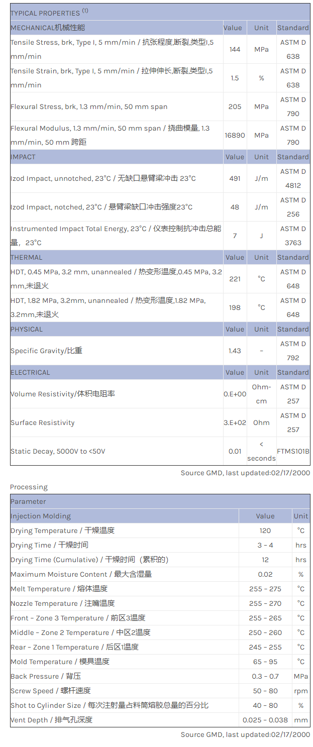 应用范围:产品描述LNP STATKON Valox_SMV5890物性表SINGLE LOT DATA. 30% carbon filled PBT. For EMI/RFI shielding applications. Will be VC3000N.