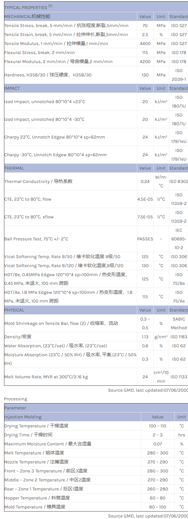 应用范围:产品描述NORYL PPO PO2357F物性表NORYL PO2357F is a 10% glass fibre reinforced, medium heat, low odour and low emission material with excellent heat aging performance. It has been developed for automotive inte