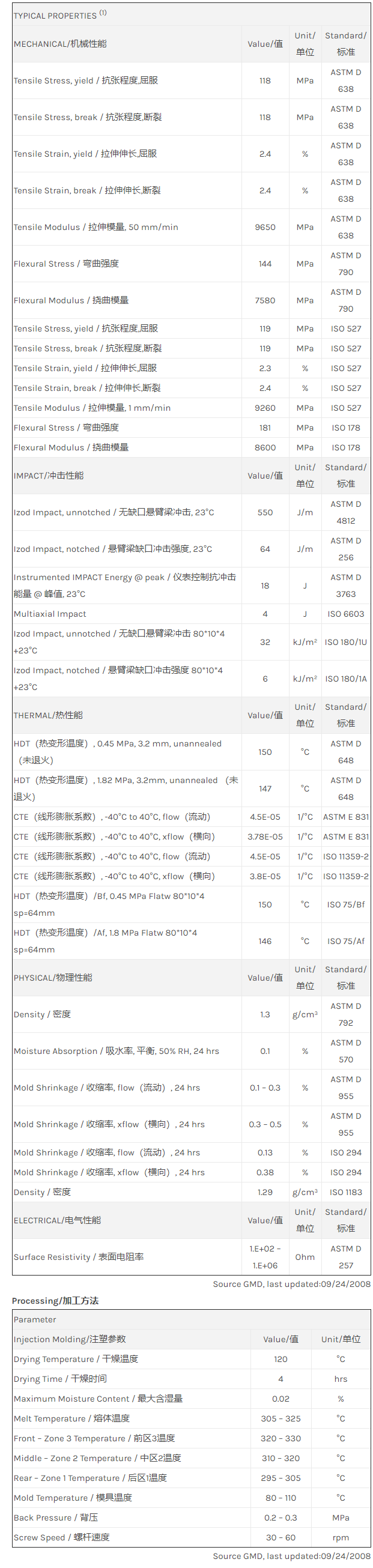 应用范围: 产品描述 LNP Statkon DE0039物性表 “LNP STAT-KON DE0039是一种聚碳酸酯(PC)产品,含有的填充物为15%碳纤维增强材料,可以通过注射成型进行加工。 特性包括: Flame Retardant 传导性” LNP* Stat-kon* DE0039 is a compound based on Polycarbonate resin contain