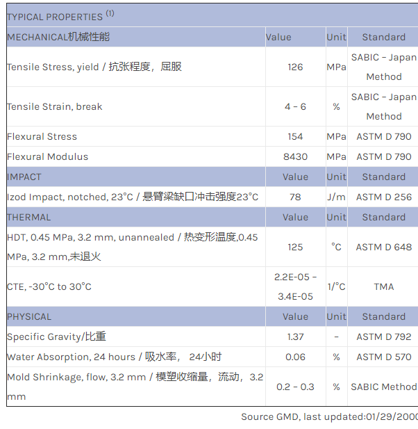 应用范围:产品描述NORYL PPO PX2956物性表NORYL PX2956 resin是一种聚苯醚+PS(PPE+PS)材料,含有的填充物为35%玻璃\矿物。