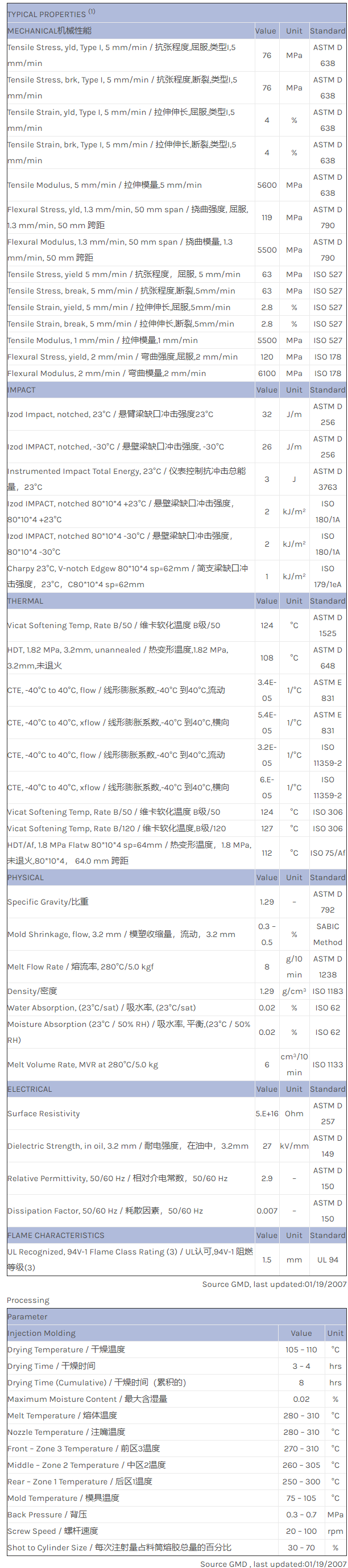 应用范围:产品描述NORYL PPO CRX2201物性表Noryl* CRX2201 resin is a 25% mineral reinforced, injection moldable modified polyphenylene ether resin designed for improved chemical resistance when compared with standard No
