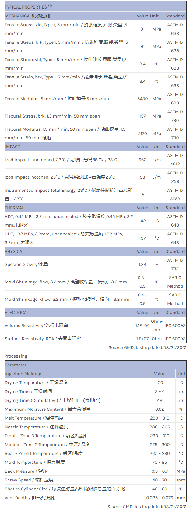 SINGLE LOT DATA. 8% carbon fiber reinforced. ESD and non-ECO flame retardant. Business and computer equipment. UL V-0 rating pending.