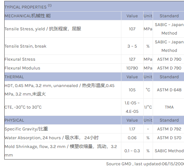 应用范围:产品描述NORYL PPO NC120物性表