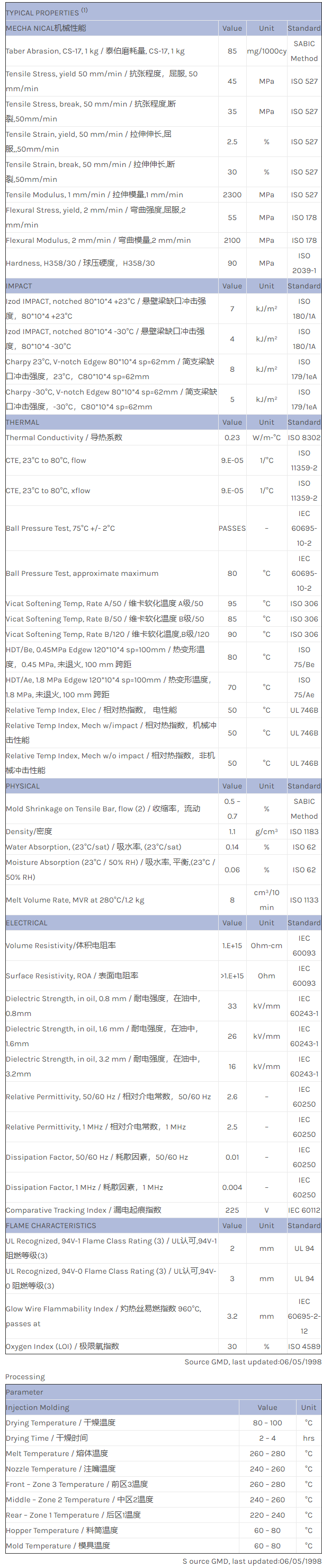 应用范围:产品描述NORYL PPO V190物性表NORYL V190 is an unfilled flame retardant material with a Vicat B/120 of 90ºC according ISO 306. NORYL V190 is V1 at 2.0 mm according UL94 and halogen free according VDE/DIN 472 p