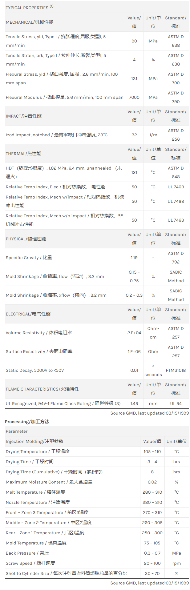 “肇庆LNP STAT-KON Noryl_HMC1508是一种聚苯醚+PS(PPE+PS)材料,加工方式为:注射成型。