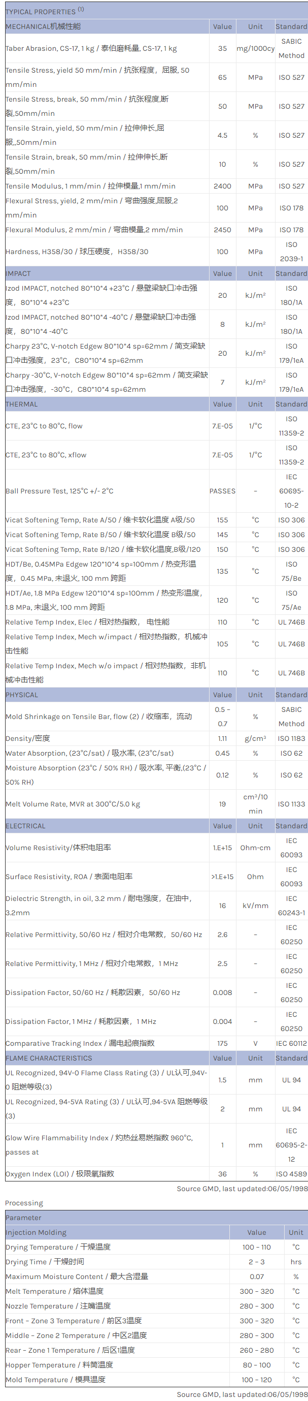 应用范围:产品描述NORYL PPO PO2209物性表Noryl PO2209 is an unfilled flame retardant material with a Vicat B/120 of 150 ºC. According to own measurements PO2209 is V0 at 1.6mm