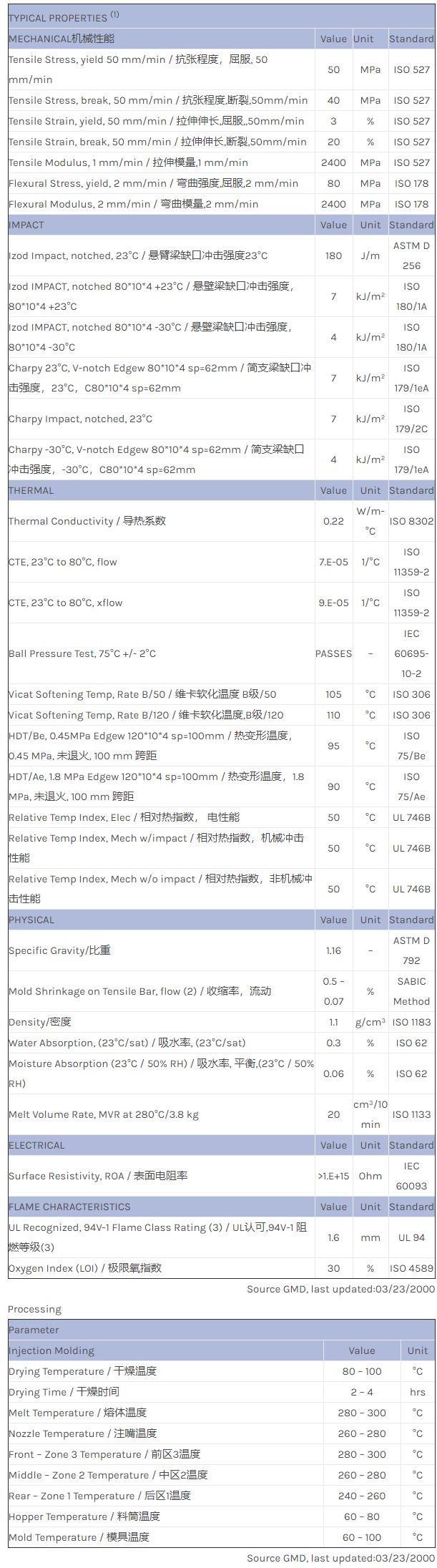 应用范围:产品描述NORYL PPO PX2000物性表NORYL PX2000 is an unfilled grade offering high impact performance over a wide temperature range and medium heat resistance by flammability rating of V-0 at 3.2 mm and a V-1 at