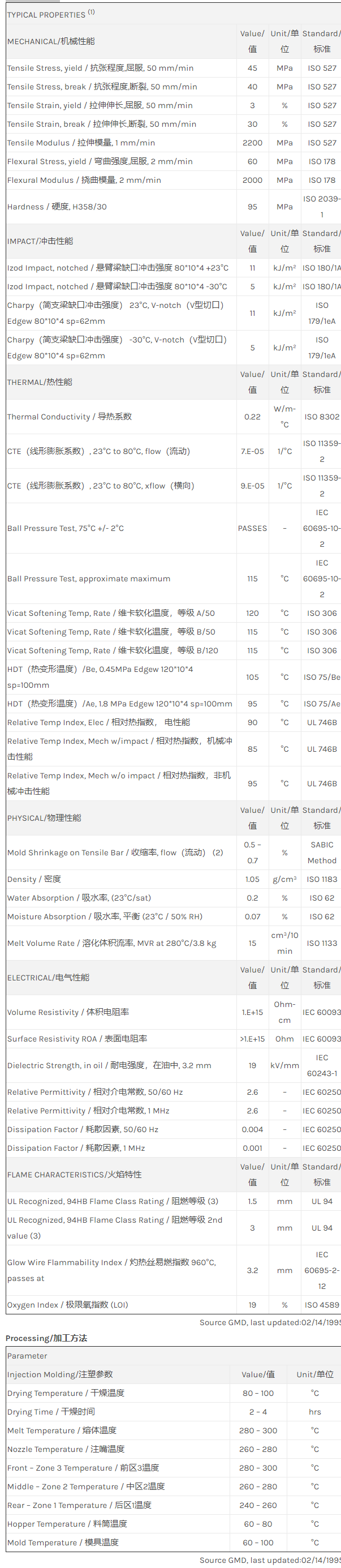 应用范围: 产品描述 Noryl PPO N110物性表 “NORYL N110 resin是一种聚苯醚+PS(PPE+PS)材料,加工方式为:注射成型。 典型应用领域为:汽车行业 主要特性有: 阻燃/额定火焰 通过 ROHS 认证 耐冲击 耐热 ” 相关颜色色号:N110-701 NORYL N110 is an unfilled material, with a Vicat B/